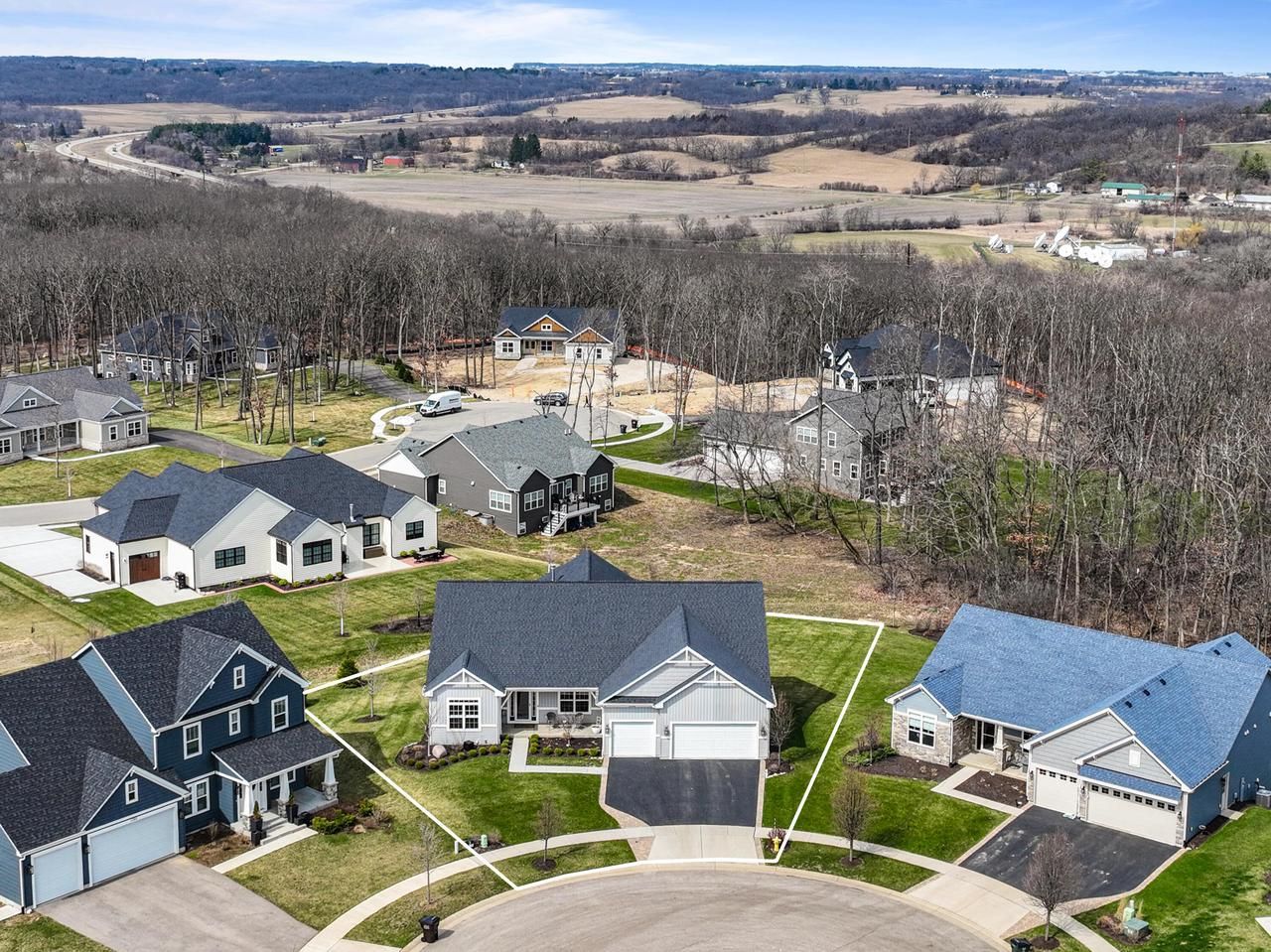 Stone Ridge, luxury Lake Geneva living in a prime cul de sac location enjoying large yard & peaceful wooded views. Welcome home to this stunning 3-bedroom 3 bath ranch with open-concept layout-perfect for entertaining. Enjoy upgraded luxury finishes, great room with fireplace, bar area, gourmet eat in kitchen, granite counters, stainless appliances, pantry and wonderful spacious open dining room. The main level office provides ideal work-from-home space. At end of day relax on the porch & enjoy beautiful sunsets! The primary suite bath boasts double vanity, shower and generous walk-in closet. The large windowed lower walkout family room opens to patio & includes 4th bedroom area, full bath and storage or additional space to finish & create. 3-car garage provides ample space.